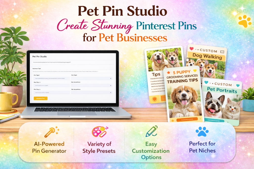 Create Eye-Catching Pinterest Pins for Your Pet Business in Minutes. Stop staring at a blank screen wondering what to post. Pet Pin Studio helps you turn one simple idea into a full Pinterest pin package, ready to use in seconds.